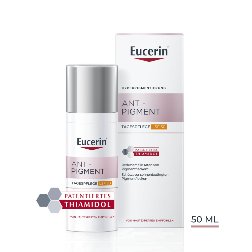 Die Eucerin® Anti-Pigment Tagespflege LSF 30 enthält den effektiven und patentierten Pflegewirkstoff Thiamidol®. Dieser wirkt von Tag 1 an auf die Melanin Produktion an ihrem Ursprung ein und lässt Pigmentflecken nach und nach verblassen. Bereits nach zwei Wochen sind erste Ergebnisse sichtbar, die sich bei regelmässiger Anwendung deutlich verbessern. Wissenschaftliche Tests belegen, dass Pigmentflecken aller Art reduziert und ihrer Neuentstehung vorgebeugt wird.