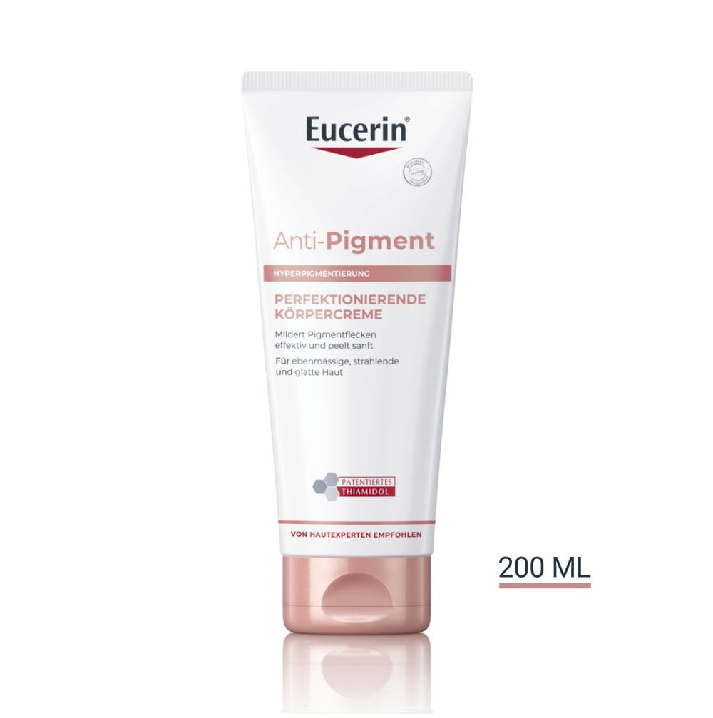 Die Eucerin ANTI-PIGMENT Perfektionierende Körpercreme bekämpft gezielt dunkle Pigmentflecken, Hautbereiche mit postinflammatorischer Hyperpigmentierung und verdickte Haut an Reibungsstellen (Knie, Ellenbogen). Probieren Sie die ANTI-PIGMENT Perfektionierende Körpercreme für eine strahlende und ebenmässige Haut am ganzen Körper: Die Creme reduziert wirksam das Auftreten von dunklen Pigmentflecken, grossflächigen Pigmentierungen und postinflammatorischer Hyperpigmentierung.