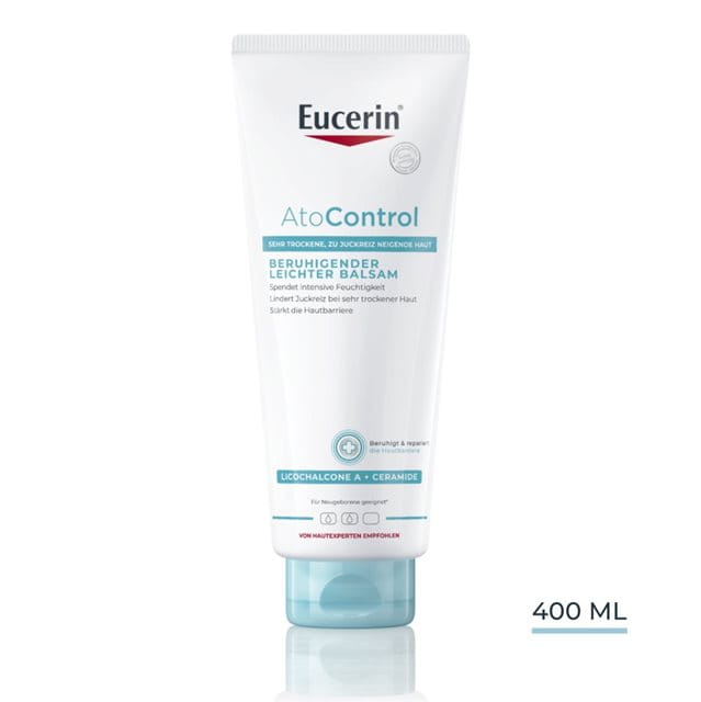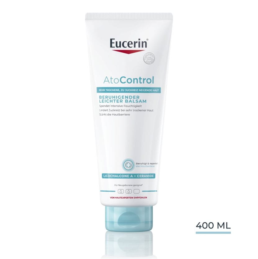 Eucerin® AtoControl beruhigender Balsam ist ein Körperbalsam für die tägliche Anwendung, der speziell entwickelt wurde, um sehr trockene, gereizte und zu Juckreiz neigende Haut zu beruhigen und intensiv mit Feuchtigkeit zu versorgen. Dieser leichte, aber pflegende Öl-in-Wasser-Balsam ist mit beruhigendem Licochalcone A, Ceramiden und Sheabutter angereichert, um die Hautbarriere zu stärken und Trockenheit und Juckreiz zu lindern*. Er versorgt die Haut sofort mit Feuchtigkeit und macht sie weich und glatt, und bei regelmässiger Anwendung verbessert sich der Hautzustand deutlich.