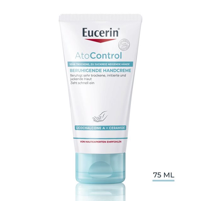 Eucerin® AtoControl beruhigende Handcreme glättet und beruhigt sehr trockene Hände. Die schnell einziehende und nicht fettende Formel enthält einen einzigartigen Wirkstoffkomplex aus beruhigendem Licochalcone A, antibakteriellem Decandiol und juckreizlinderndem Methoxypropandiol (MPD). Dieser Komplex, kombiniert mit einer hohen Konzentration an Ceramiden und Avena Sativa (Haferflocken), wirkt als starker Feuchtigkeitsspender, stärkt die Hautbarriere, lindert Trockenheit und lindert das Juckreizgefühl.