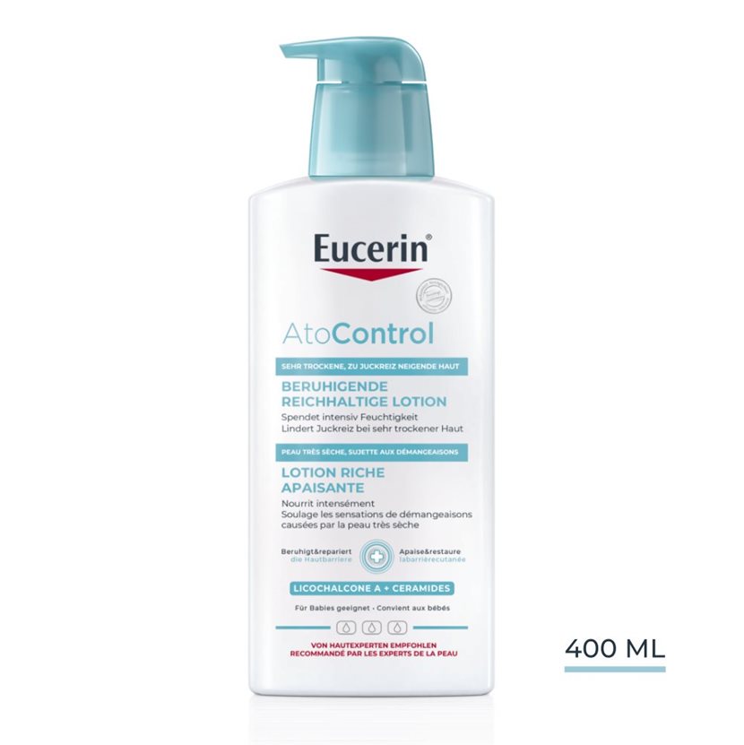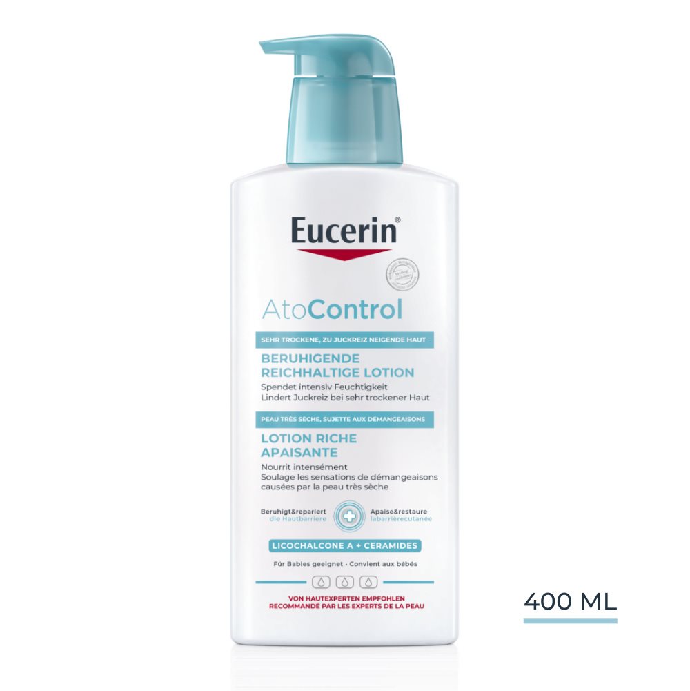 Eucerin® AtoControl beruhigende, reichhaltige Lotion ist eine Lotion für den täglichen Gebrauch, die speziell dafür entwickelt wurde, gereizte und zu Juckreiz neigende Haut zu beruhigen und intensiv mit Feuchtigkeit zu versorgen. Diese schnell einziehende Wasser-in-Öl-Lotion ist mit beruhigendem Licochalcone A, Ceramiden und Omega-Ölen angereichert, um die Hautbarriere zu stärken und Trockenheit und Juckreiz zu lindern*. Bei regelmässiger Anwendung verbessert sich der Hautzustand spürbar und die Haut wird weicher und glatter.