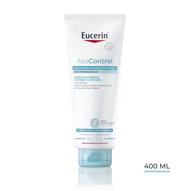 Eucerin® AtoControl beruhigende Hydro-Lotion ist eine täglich anzuwendende Körperpflege, die speziell entwickelt wurde, um sehr trockene und zu Juckeiz neigende Haut zu beruhigen und intensiv mit Feuchtigkeit zu versorgen. Die Kombination aus Licochalcone A, Hyaluronsäure und Ceramiden bietet eine schnell wirkende Linderungzu Juckeiz neigende Haut, für lang anhaltenden Hautkomfort. Die Hydro-Lotion spendet bis zu 48h Feuchtigkeit und macht die Haut weich und geschmeidig.