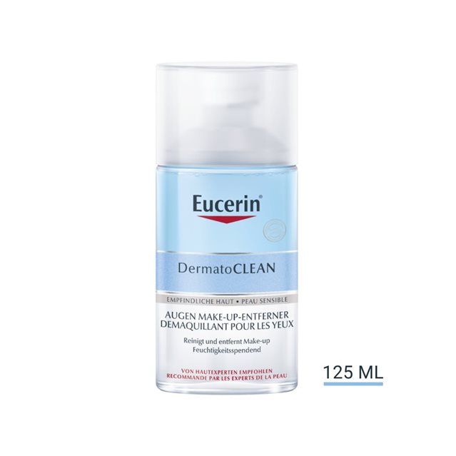 Eucerin DermatoCLEAN Augen Make-up-Entferner entfernt sanft und gründlich Augen-Make-up und wasserfestes Mascara und befreit die Haut von Schmutzpartikeln. Die nicht fettende, zweiphasige Formel entfernt mit der oberen Schicht wasserfestes Make-Up und mit der unteren Schicht wasserlösliches Make-Up.