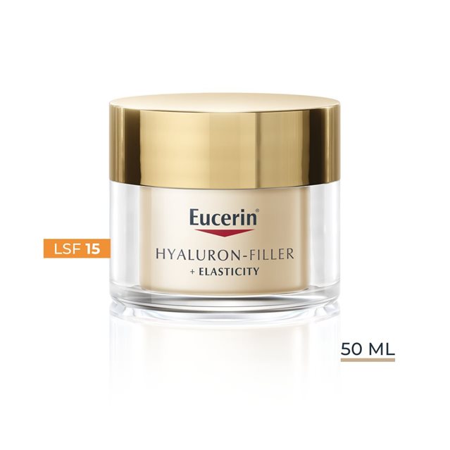 Eucerin Hyaluron-Filler + Elasticity Tagespflege LSF 15 bietet mit LSF 15 und einem UVA-Filter einen wirksamen Schutz vor lichtbedingter Hautalterung und Faltenvertiefung.