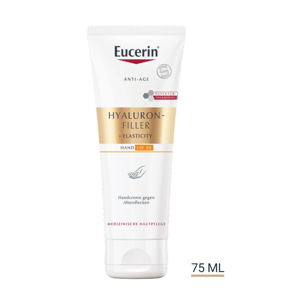 Um Altersflecken zu mildern und ihrer Neuentstehung vorzubeugen, haben wir die Eucerin® HYALURON-FILLER + ELASTICITY Handcreme gegen Altersflecken LSF 30 entwickelt. Sie zieht schnell ein, verbessert die Elastizität der Haut und versorgt sie bis zu 24 Stunden mit Feuchtigkeit.
