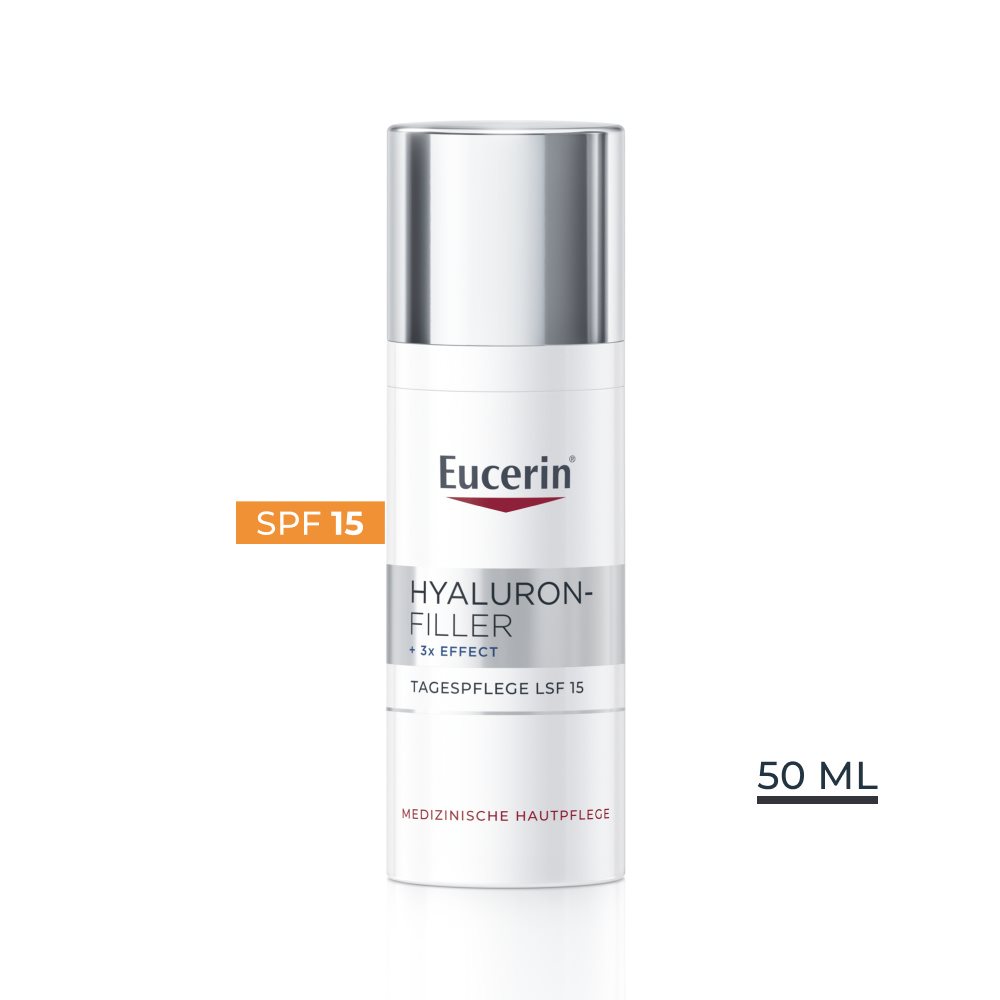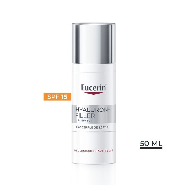 Eucerin Hyaluron-Filler +3x Effect Tagespflege LSF 15 für Normale bis Mischhaut wirkt dem Alterungsprozess der Haut entgegen. Sie füllt selbst tiefere Falten auf, festigt sichtbar und spendet der Haut intensive Feuchtigkeit. Mit LSF 15 und einem UVA-Filter schützt sie die Haut vor vorzeitiger lichtbedingter Hautalterung.