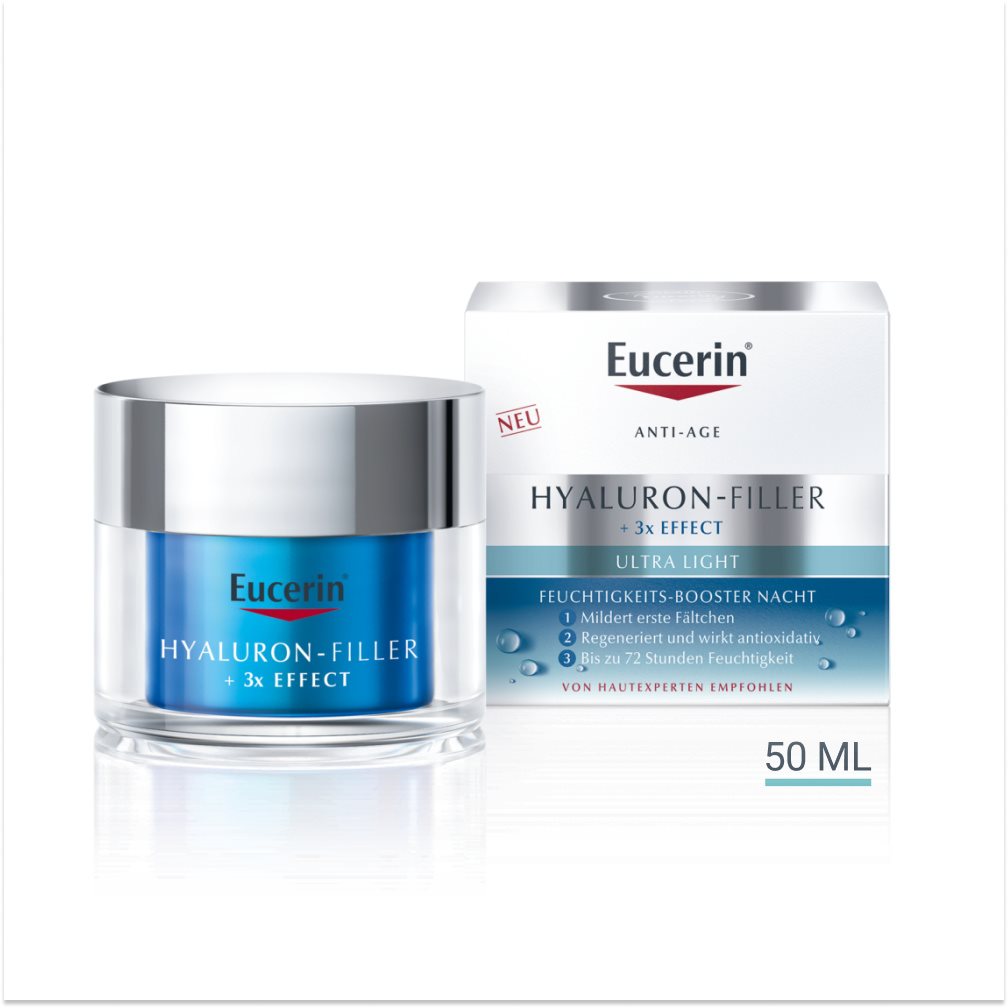 Die Haut regeneriert sich über Nacht. Neben der Feuchtigkeitsversorgung enthält Nachtpflege Produkte Inhaltsstoffe, die den Zellregenerationsprozess anregen. Im Eucerin Hyaluron-Filler +3x Effect Hydra Nacht Gel unterstützt der Inhaltsstoff ProVitamin B5 die Hauterneuerung über Nacht.