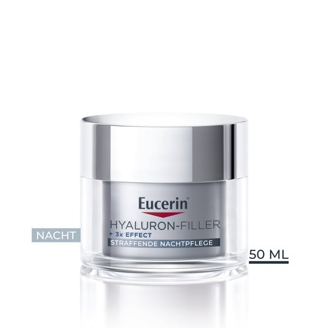 Eucerin Hyaluron-Filler +3x Effect Straffende Nachtpflege wirkt dem Alterungsprozess entgegen. Sie füllt tiefere Falten, strafft die Haut sichtbar und regeneriert die Haut über Nacht. Eucerins einzigartige Mischung aus hoch- und niedermolekularem Hyaluronsäure bietet einen gezielten Ansatz, um selbst tiefe Falten sichtbar aufzupolstern. Die hochmolekulare Hyaluronsäure verbessert die Feuchtigkeit und glättet die obersten Hautschichten, während die niedermolekulare Hyaluronsäure, die 40-mal kleiner ist (1), tiefer in die epidermalen Hautschichten eindringt, in denen tiefere Falten entstehen.