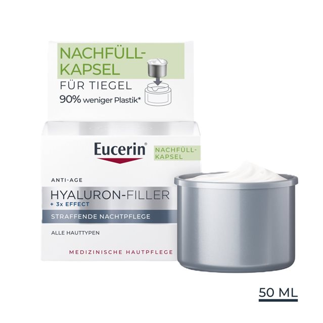 Eucerin Hyaluron-Filler +3x Effect Straffende Nachtpflege wirkt dem alternden Prozess entgegen. Sie füllt tiefere Falten auf, strafft und regeneriert die Haut sichtbar über Nacht. Die Nachfüllkapsel enthält 90 % weniger Kunststoff als der normale Hyaluron-Filler-Tiegel.