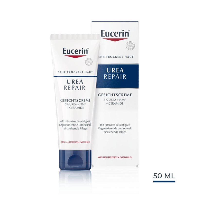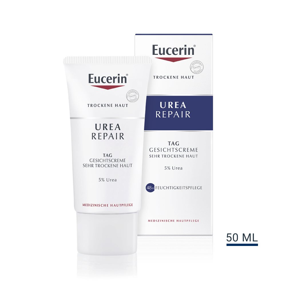 Die Haut wird wieder spürbar glatter und geschmeidiger. Eucerin UreaRepair Gesichtscreme ist eine schnell einziehende Feuchtigkeitscreme für jeden Tag für trockene bis sehr trockene Haut, die zu Schuppenbildung und Spannungsgefühlen neigt. Angereichert mit Urea und Laktat, zwei natürlichen, feuchtigkeitsbindenden Präparaten, versorgt die Creme trockene Gesichtshaut sofort mit Feuchtigkeit. Die UreaRepair Gesichtscreme bewahrt zudem die Hautfeuchtigkeit und macht raue Haut geschmeidiger. Sie ist ideal als Make-up-Unterlage oder nach der Rasur.