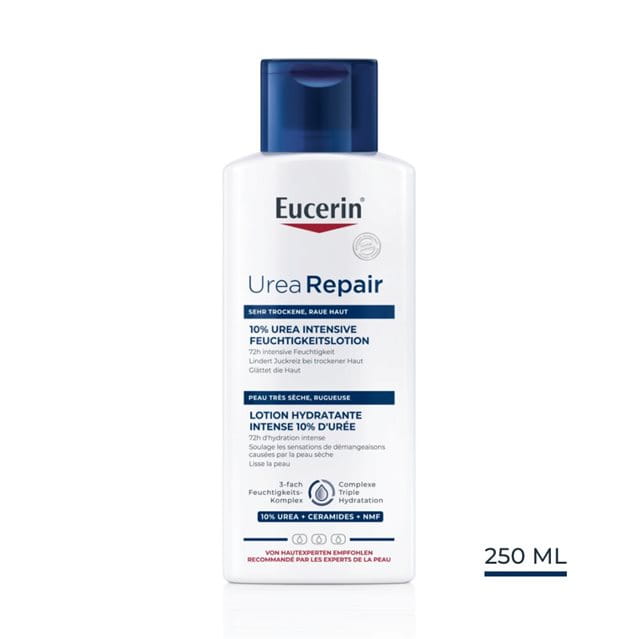 Eucerins UreaRepair 10% Urea Intensive Feuchtigkeitslotion für extrem trockene Haut enthält eine hohe Konzentration an Urea und anderen natürlichen Feuchtigkeitsspendern (um Wasser in der Haut zu binden) und Ceramide (um die Hautbarriere zu reparieren und den Feuchtigkeitsverlust zu reduzieren). Die Formel verschafft sofortige Linderung und wirkt weiter, indem sie die Symptome sehr trockener, rauer Haut bis zu 72 Stunden hinauszögert.